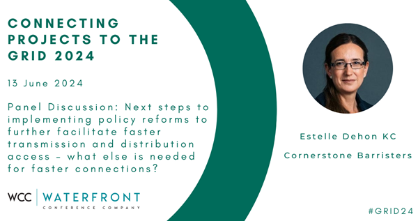 Cornerstone Barristers is delighted to be participating in the 2024 Connecting Projects to the Grid conference which is being hosted on 13th June 2024 at Addleshaw Goddard’s London office at 60 Chiswell Street, London EC1Y 4AG. Estelle Dehon KC will be participating in a panel discussing the steps needed to implement policy reforms to facilitate faster transmission and distribution access.